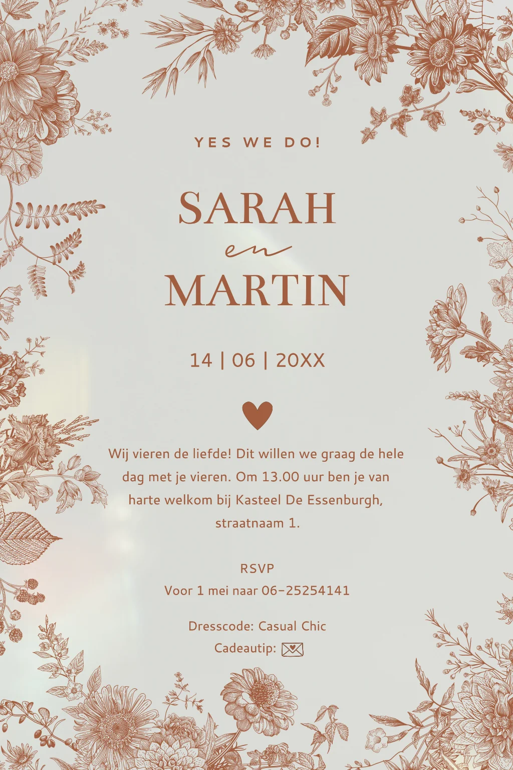 Bij een bijzondere dag, hoort een bijzondere kaart! Hoe mooi is deze acryl trouwkaart met bloemenkader? Pas de kleuren naar wens aan!