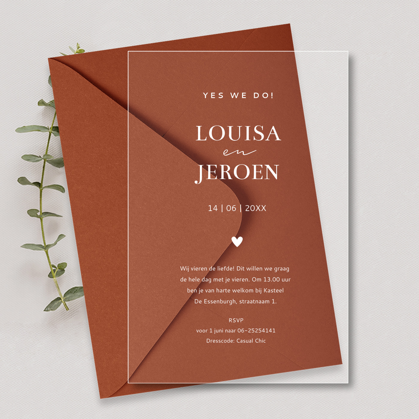 Deze doorzichtige trouwkaart op acryl is een luxe uitnodiging voor jullie bruiloft! De kaart is gedrukt op plexiglas en heeft witte letters. Pas de kaart nog naar wens aan!