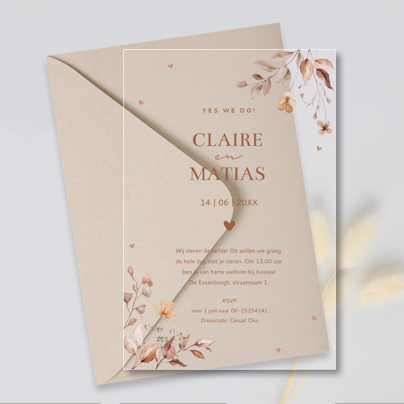 Bij een bijzondere dag, hoort een bijzondere kaart! Hoe mooi is deze acryl trouwkaart met bloemen en bladeren?
