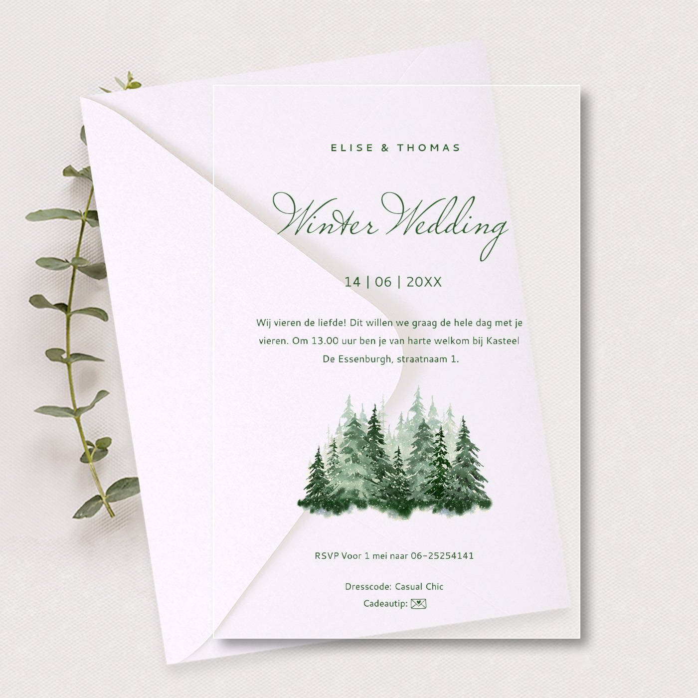 Bij een bijzondere dag, hoort een bijzondere kaart! Hoe mooi is deze acryl trouwkaart met winter wedding thema.