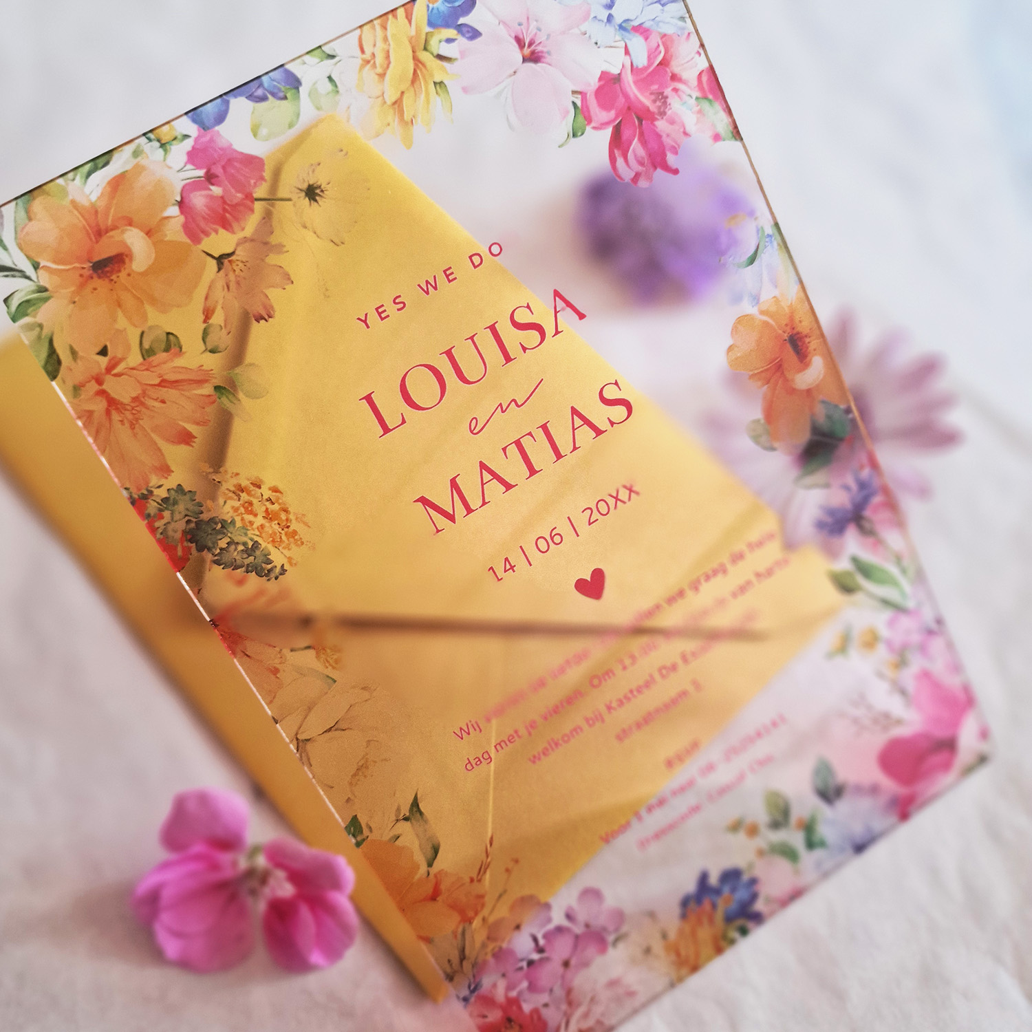 Bij een bijzondere dag, hoort een bijzondere kaart! Hoe mooi is deze acryl trouwkaart met fleurige bloemen?